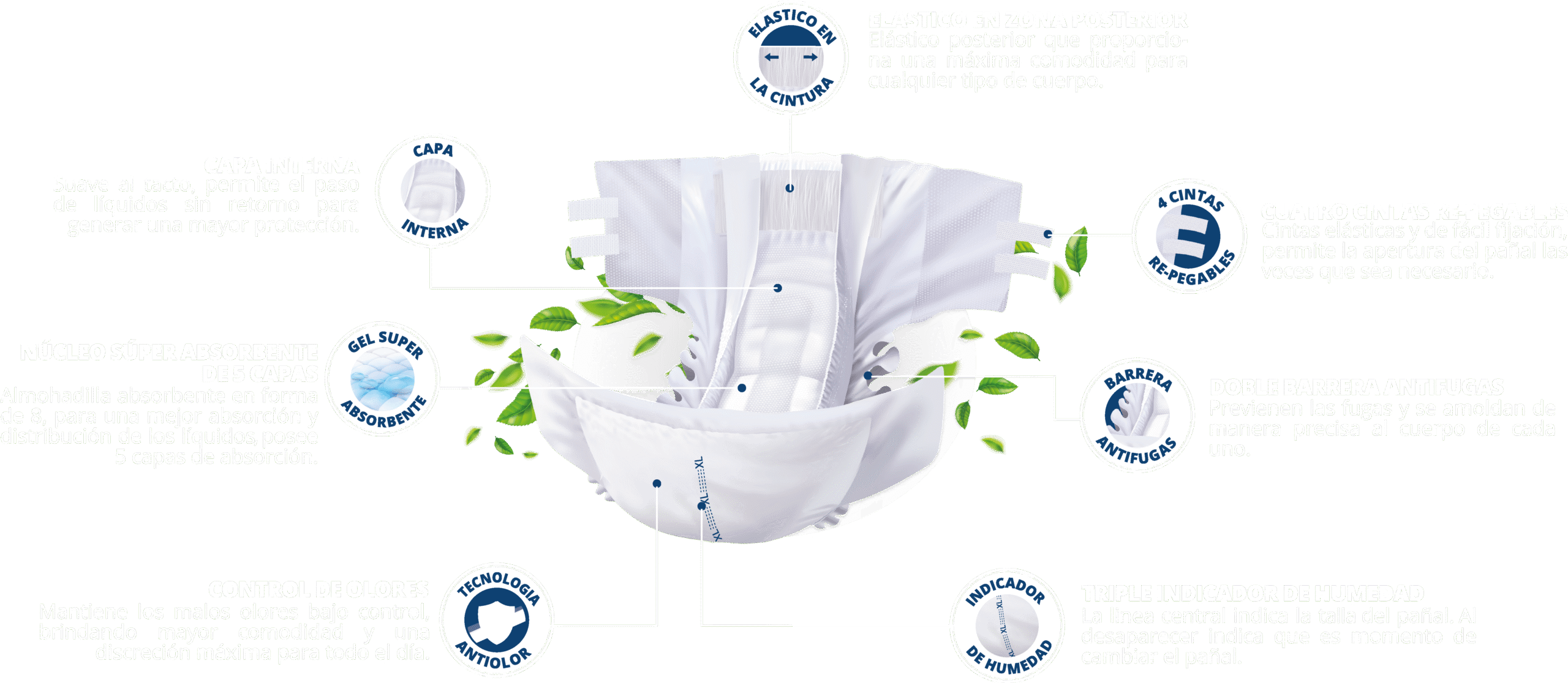 Ofrece control de olores, triple indicador de humedad y un ajuste cómodo gracias a su elástico posterior y cuatro cintas elásticas repegables que permiten abrir y cerrar el pañal sin perder adherencia.