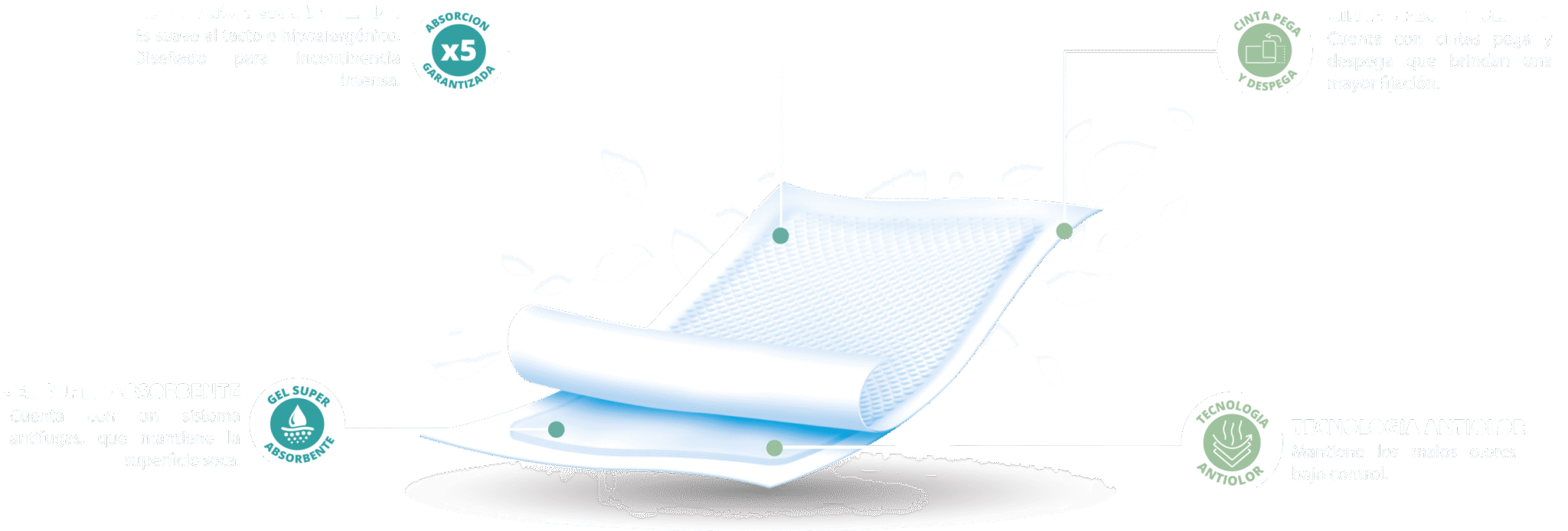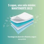 Gracias a su sistema de 5 capas de absorción y tecnología japonesa, distribuye el líquido de forma rápida y uniforme, manteniendo la piel seca por más tiempo. Su núcleo compuesto por SAP (polímero súper absorbente) y pulpa de celulosa bloquea el olor y la humedad, brindando seguridad y confort.